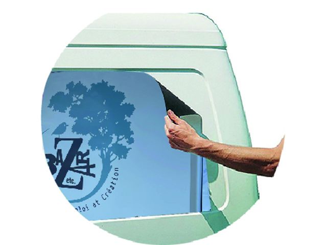 L’adhésif micro-perforé se prête particulièrement à la pose sur vitres et lunettes arrières de véhicules. Il n’ôte pas la visibilité depuis l’intéreur